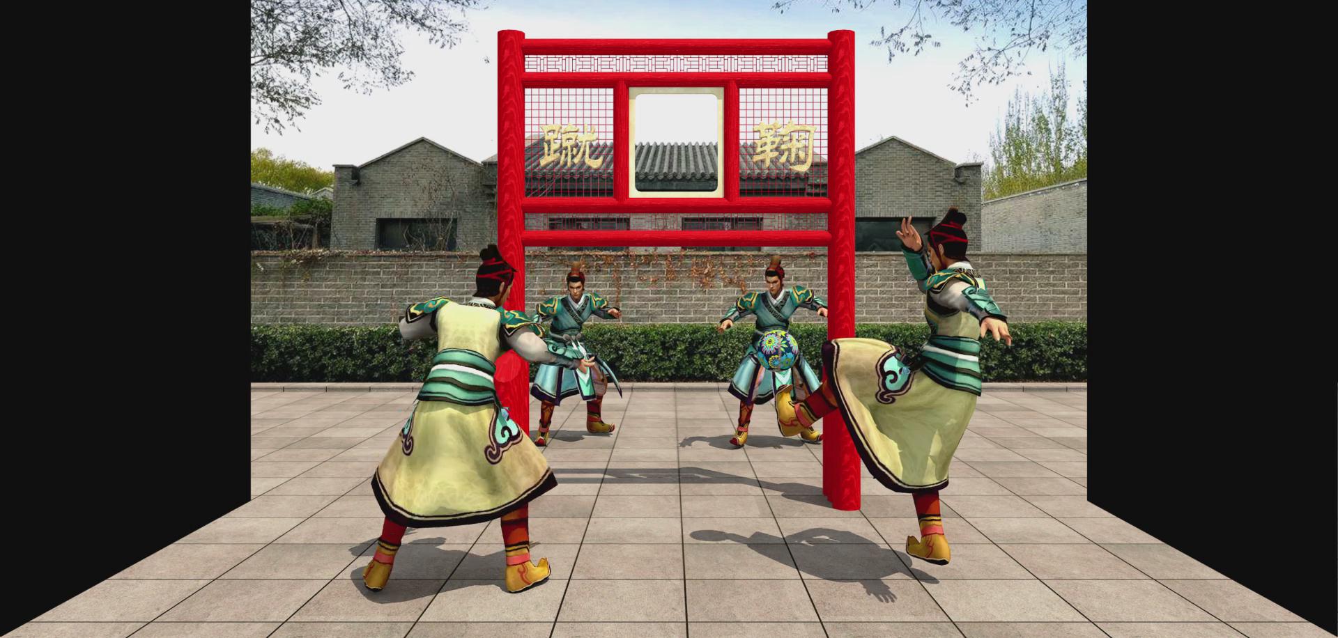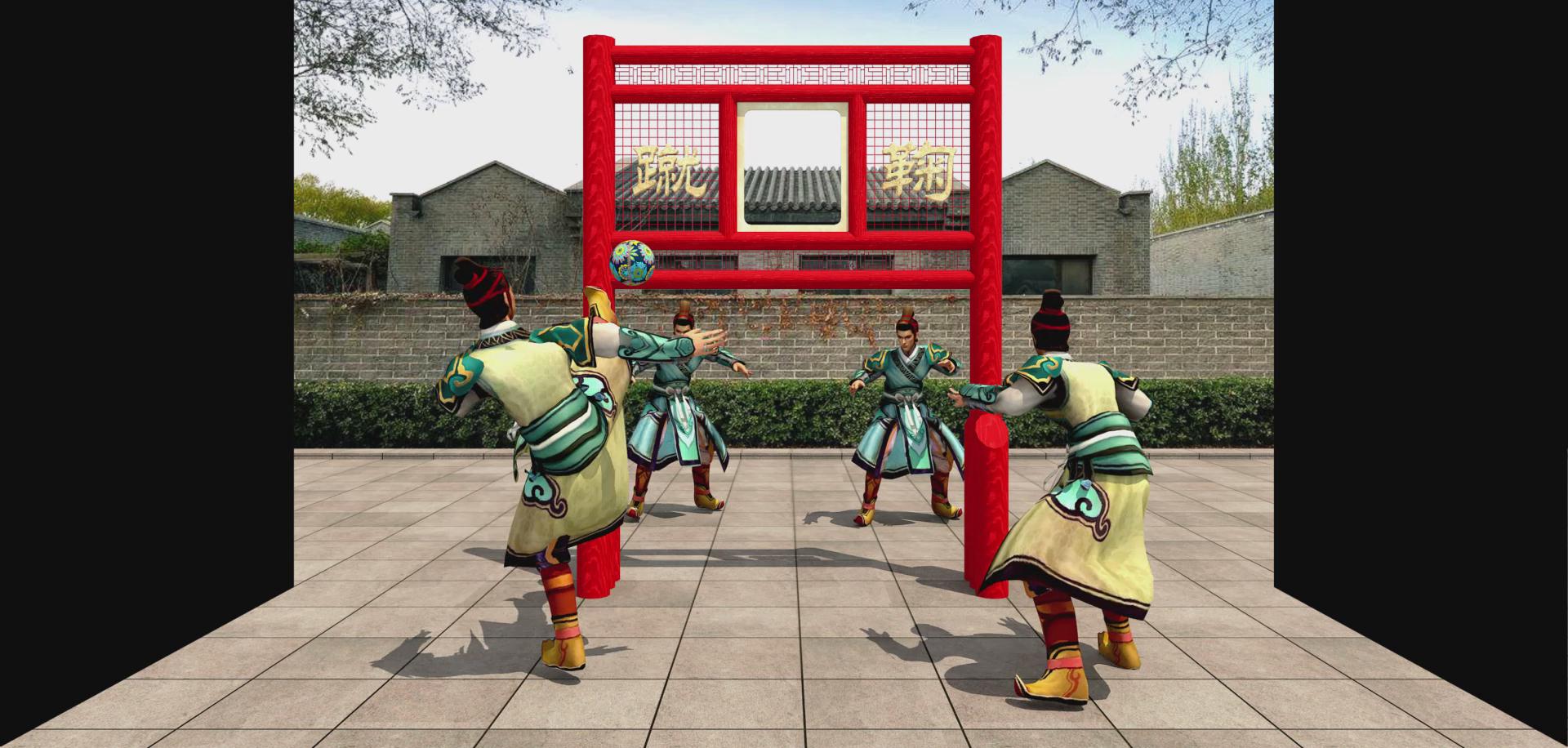 蹴鞠就是指古人以腳蹴、蹋、踢皮球的活動,類似今日的足球。據史料記載,早在戰國時期中國民間就流行娛樂性的蹴鞠游戲,而從漢代開始又成為兵家練兵之法,宋代又出現了蹴鞠組織與蹴鞠藝人,清代開始流行冰上蹙鞠。因此,可以說蹴鞠是中國古代流傳久遠、影響較大的一朵體育奇葩。2006年5月20日,蹴鞠已作為非物質文化遺產經國務院批準列入第一批國家級非物質文化遺產名錄。 該影片展現了蹴鞠的風采,兩兩組隊自成兩隊,折幕展示形式使得效果立體,仿佛觀看了一場實時的蹴鞠比賽,十分有趣。